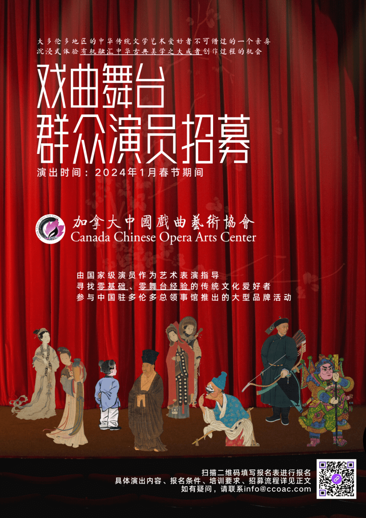 为了加中戏协的下一场大型演出做准备,为确保今年的“欢乐春节”新年戏曲晚会顺利进行,本协会将在大多伦多地区招募10名左右群众演员协助完成舞台表演工作。