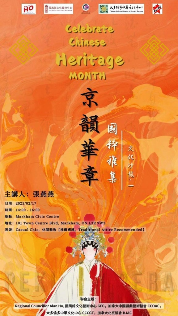 联合主办:Regional Councillor Alan Ho,国风馆文化艺术中心GFG,加拿大中国戏曲艺术协会 CCOAC,大多伦多中华文化中心CCCGT,加拿大北京协会BJAC